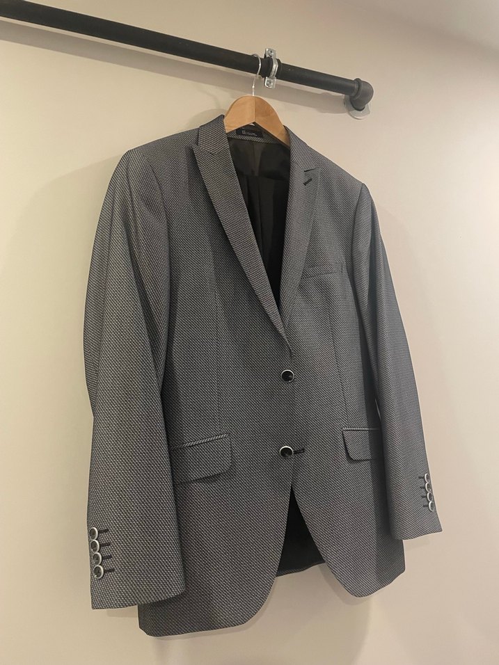 Gri renkte, düğmeli ve normal boyda erkek takım ceketi. Notch yakalı, uzun kollu ve desen içermeyen klasik şıklıkta bir modeldir. Pantolon Altınyıldız marka. Beden: 50/6