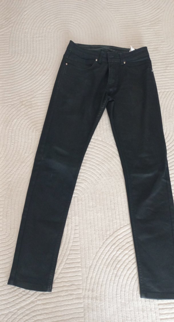 Siyah, kemerli, sli fit erkek kot pantolon. Pamuklu denim kumaştan, desen içermeyen, günlük kullanıma uygun.diz kısmının arka tarafında fotosunu çektim minik bir defosu var onun dışında sıfır ayarında bir pantalon