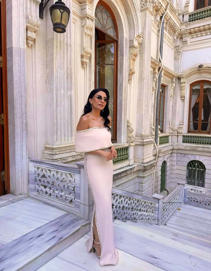HAUTE COUTURE OZEL DİKİM Pudra Renk Straplez Uzun Abiye Elbise