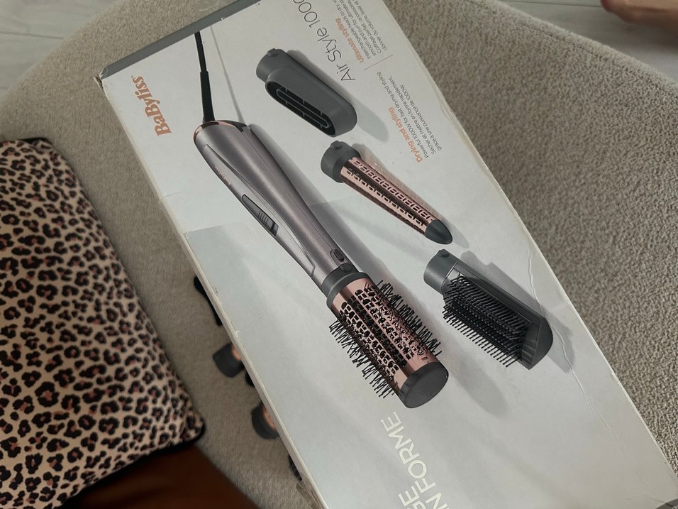 Gri ve kahverengi renkli saç şekillendirici set, fırça, maşa ve kurutma başlıkları ile çeşitli saç stilleri oluşturur. Ürün 2 aylık falan ve çok fazla kullanılmadı istediğim farklı bir ürünü aldıgım için bunu satıyorum