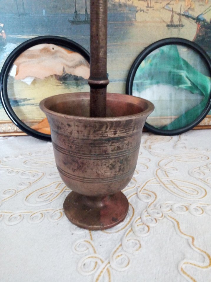 Koyu kahverengi bakır havan ve tokmak, mutfakta baharat öğütmek için klasik tasarıma sahiptir.