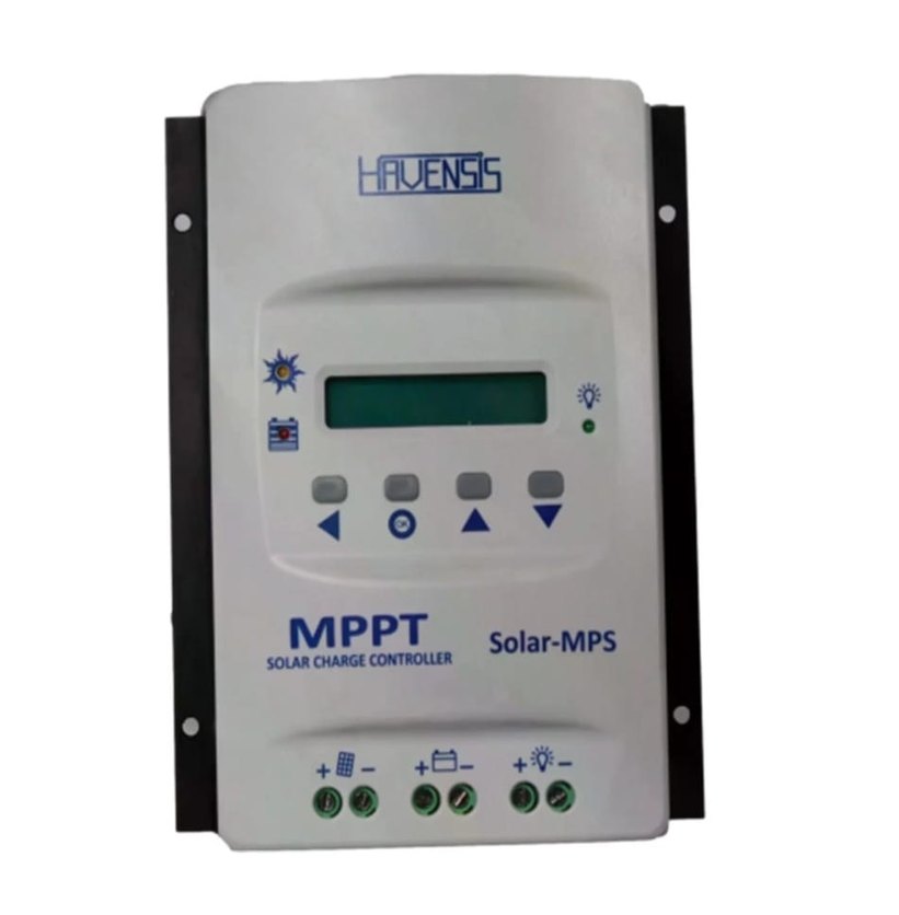 Havensıs MPPT Solar-MPS, güneş enerjisi şarjını optimize eden beyaz renkli şarj kontrol cihazıdır. Dijital ekran ve kontrol düğmeleri bulunur. temiz sorunsuz kutulu⚡