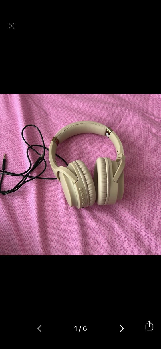 Bej renkte, yumuşak kulak pedlerine ve ayarlanabilir başlık kısmına sahip kablolu ve kablosuz kullanıma uygun kulaklık .
