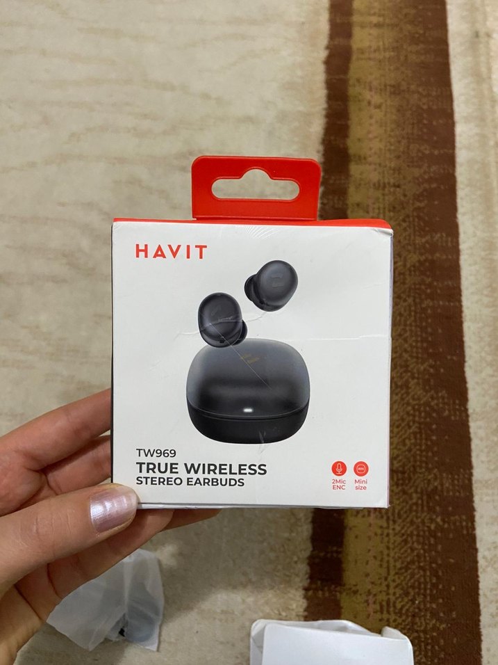 Havit TW969 siyah kablosuz stereo kulaklıklar, kompakt şarj kutusu ve net ses için gürültü azaltma teknolojisi sunar.