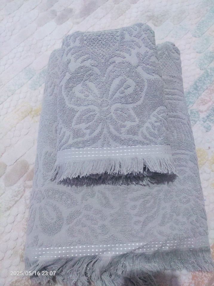 Gri renkte, nakış desenli ve püsküllü kenarlara sahip konvansiyonel tarzda havlu veya set yapilabilir . %100 Pamuk Ebatları geniş