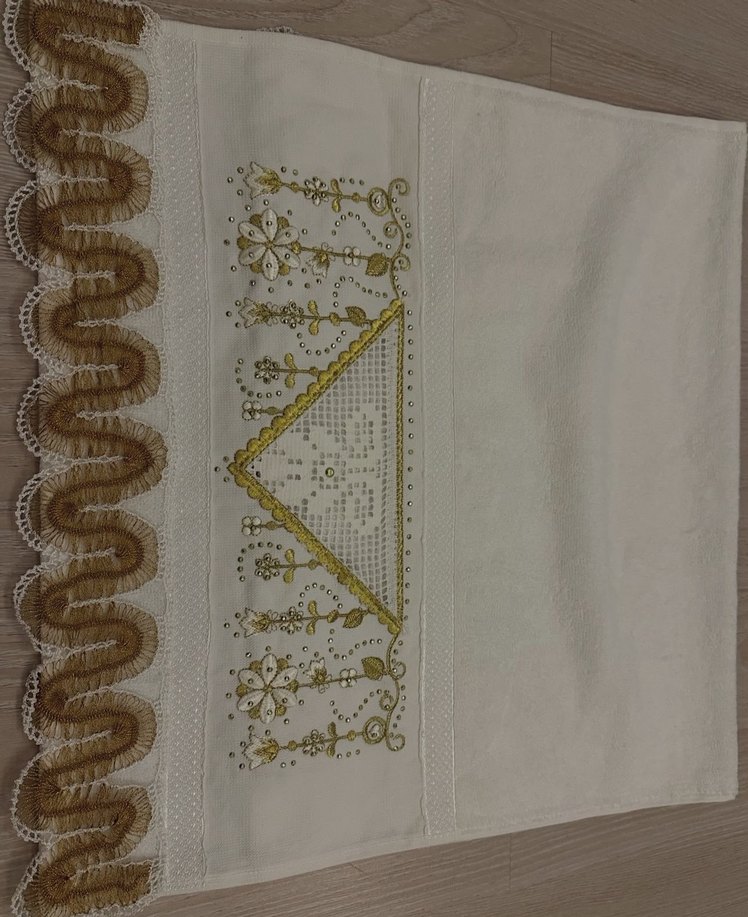 İşlemeli beyaz havlu, parlak altın renkli çiçek desenleri ve kahverengi dantel süslemesi içerir. ✨