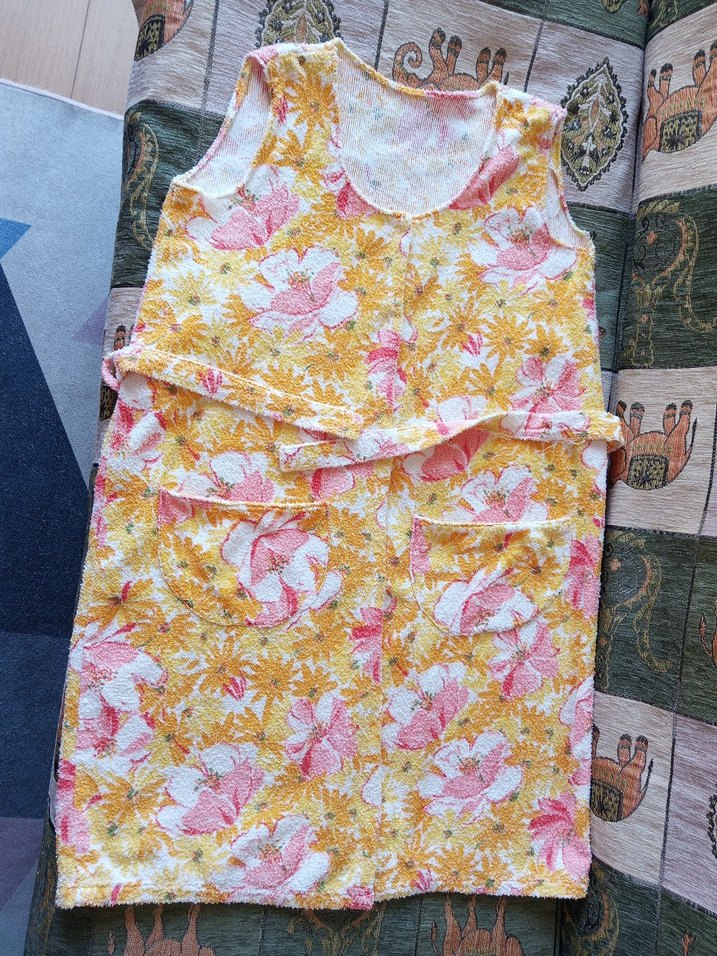 Renkli sarı havlu plaj elbisesi önü citcitli çiçek desenli baskı, ön cepler ve bel bağı ile kullanışlıdır. omuz 37 cm koltukaltı 51 cm boyu 91 cm