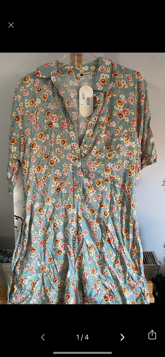 Düğmeli, kısa kollu ve V yakalı bu midi elbise bol kesimdir. Yumuşak tekstil malzemeden üretilmiş, pastel turkuaz zemin üzerinde çiçek desenlidir. Bohem tarzını yansıtır.
