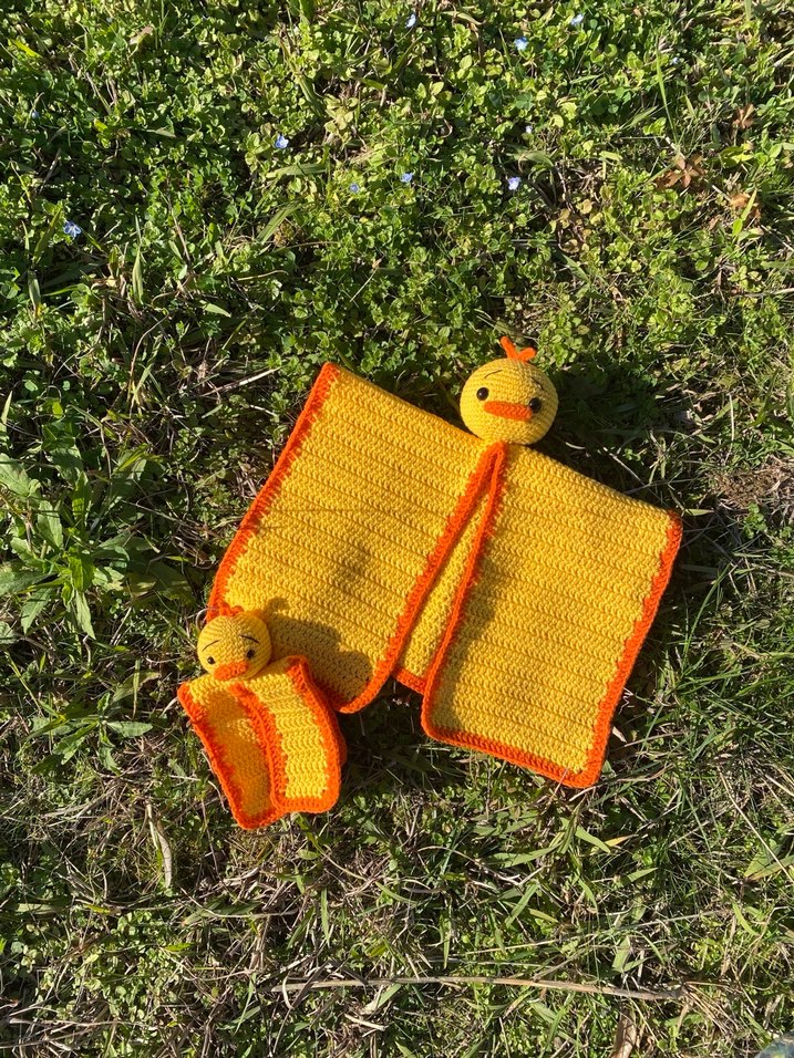 Sarı ve turuncu renkli örgü ördek peluş oyuncak ve kenarları turuncu olan örtüden oluşan set, rahatlık sağlar.