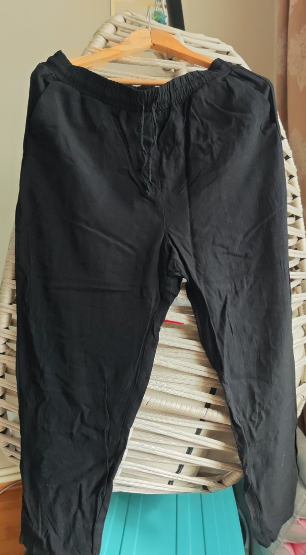 Siyah keten karışımlı rahat kesim bilek boy pantolon, günlük kullanıma uygun şık ve rahat bir tasarıma sahiptir.hiç giyilmedi herhangi bir sorunu yoktur.