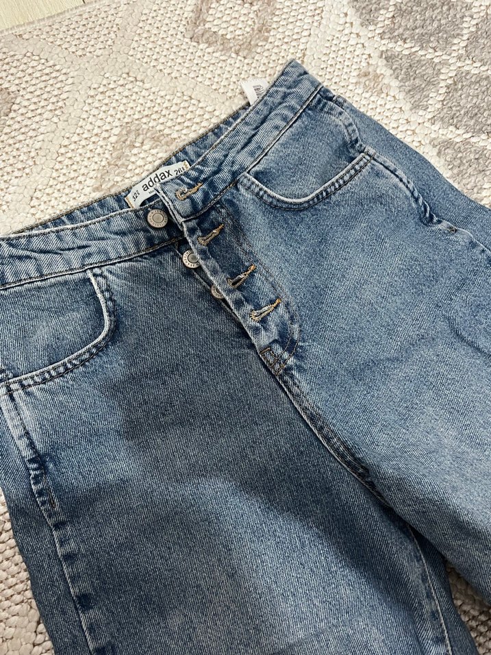 Düğmeli, bol kesim mavi denim pantolon. Normal boyda, günlük kullanıma uygun rahat ve trend bir stil sunar.