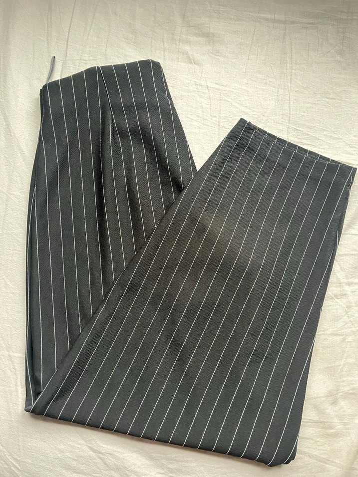 Gri renkli kadın kumaş pantolon, pileli ve çizgili desene sahiptir. Sentetik kumaştan yapılmış, ofis için uygun sokak stili sunar.
