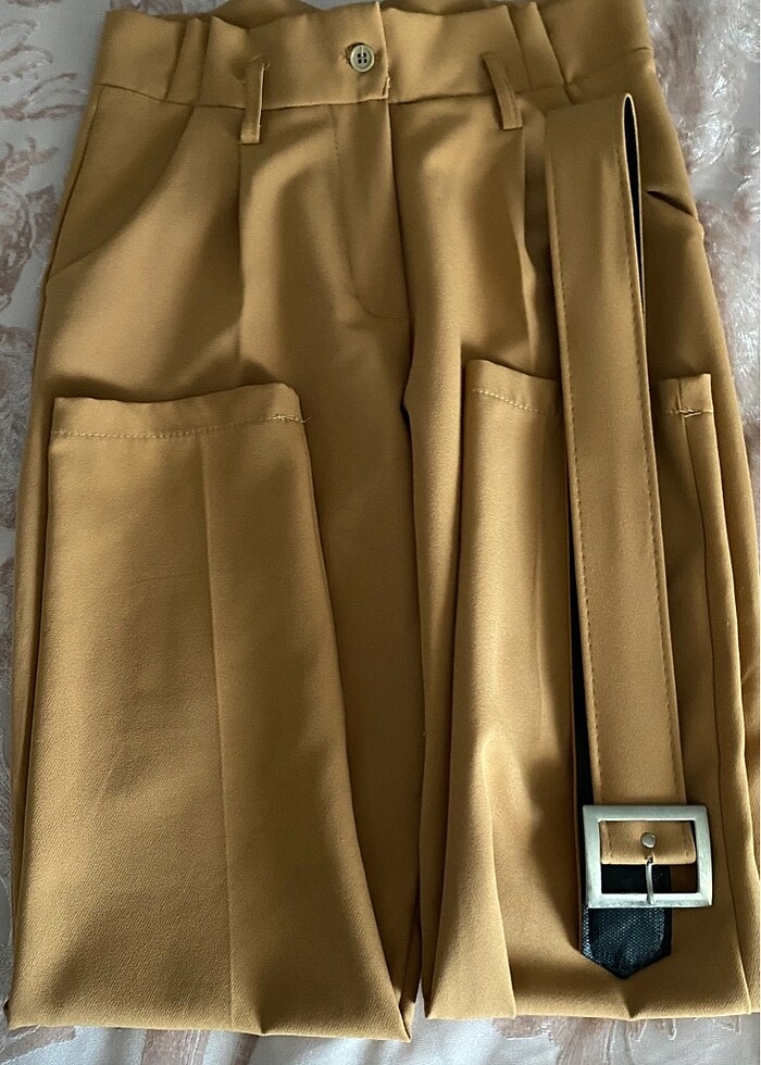 Kumaş pantolon hardalımsı renktir kemerlidir moda gülaydan alındı temizdir
