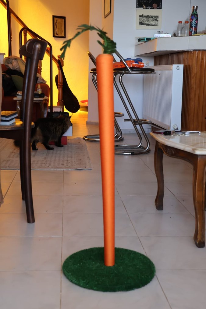 Yeşil tabanlı ve yapraklı turuncu havuç şeklinde renkli kedi tırmalama sehpası. Canım kedim hiçbir tırmalama sehpasına tırnağını bile değdirmediği için ne yazık ki bunu da hiç kullanılmadı.