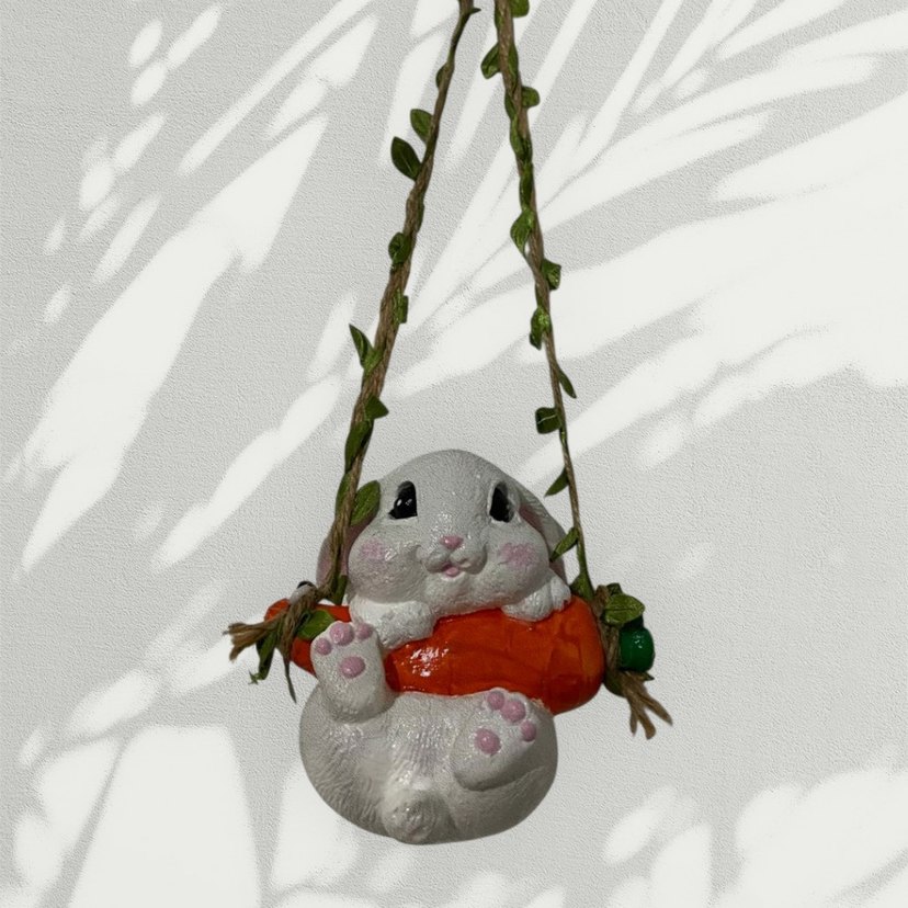 Pastel tonlarda beyaz tavşan figürin, parlak turuncu havuç tutuyor ve yapraklı ip ile asılıyor.