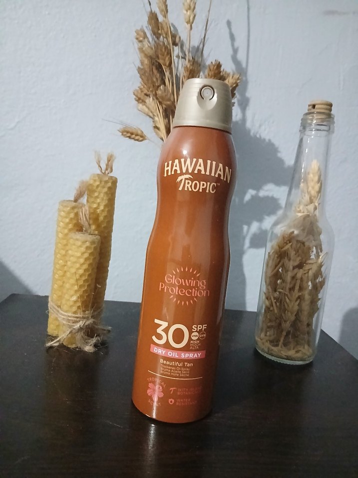 Hawaiian Tropic kuru yağ sprey, SPF 30 güneş koruması sağlar ve parlak bir bronzluk kazandırır.