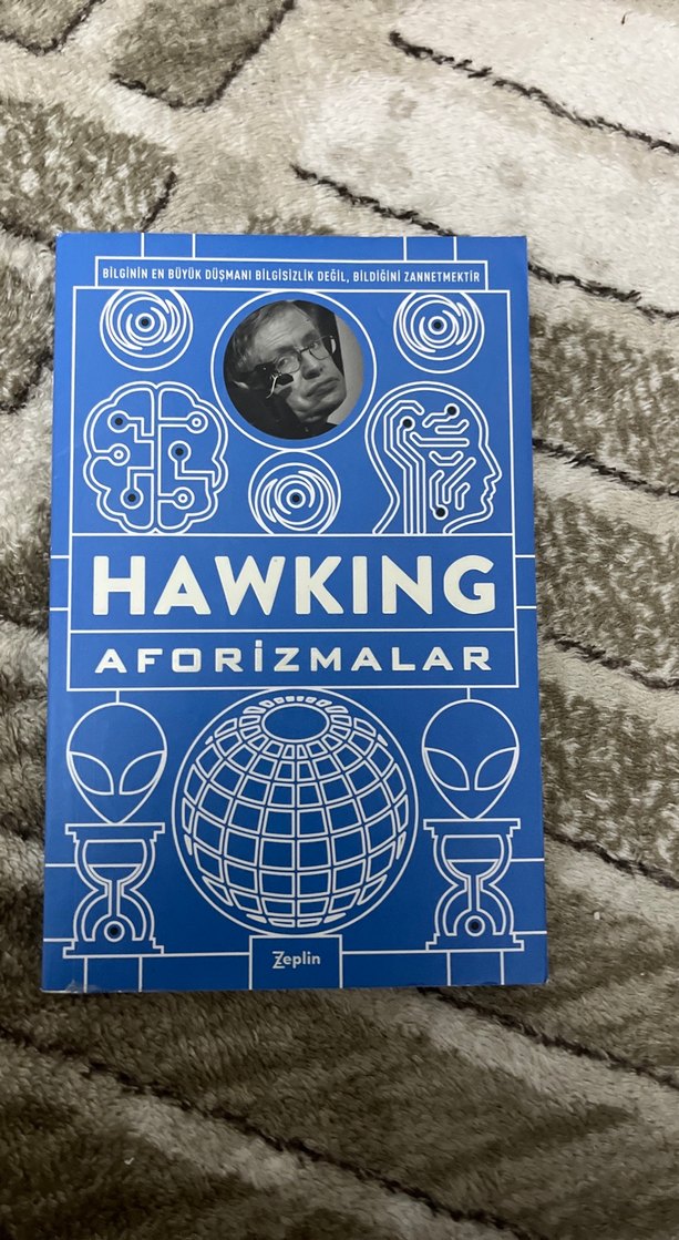 Zeplin'den 'Hawking Aforizmalar' adlı mizah kitabı, bilimsel dokunuşlu düşündürücü aforizmalar içeriyor. Kapakta Stephen Hawking'in fotoğrafı ve sembolik çizimler var.