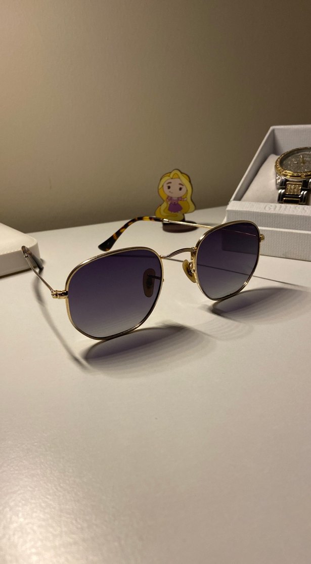 Klasik ve karşı kültür tarzını yansıtan koyu renkli altın çerçeveli, şeffaf koyu renk camlı kadın güneş gözlüğü. ️