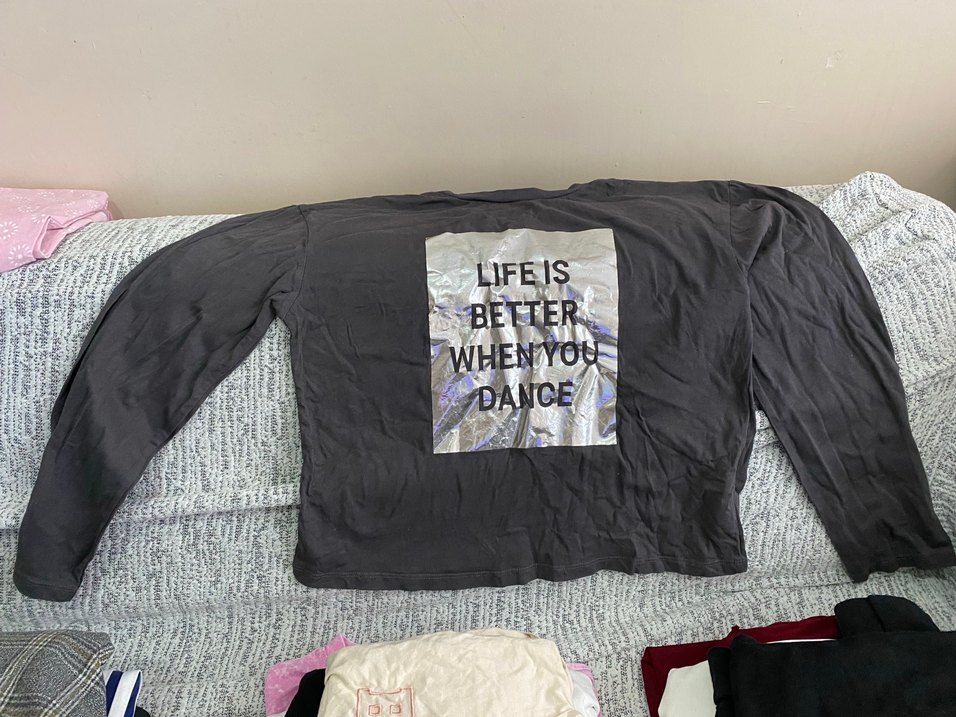 Bol kesim, uzun kollu, yuvarlak yakalı siyah çocuk tişörtü. Keten kumaştan, üzerinde "LIFE IS BETTER WHEN YOU DANCE" yazılı gümüş baskı ve uzun kol detaylı. Kısa boy, sokak stili için uygun.