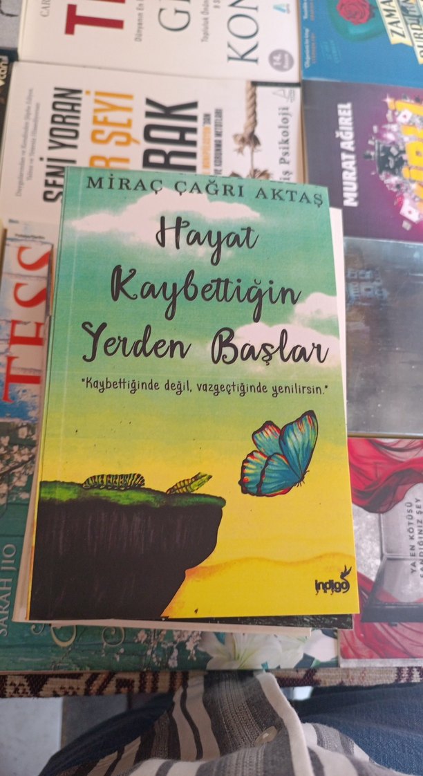 Miraç Çağrı Aktaş'ın 'Hayat Kaybettiğin Yerden Başlar' adlı şiir kitabı, yenilenmeyi simgeleyen kelebek görseli ve 'Kaybettiğinde değil, vazgeçtiğinde yenilirsin.' alıntısını içerir.