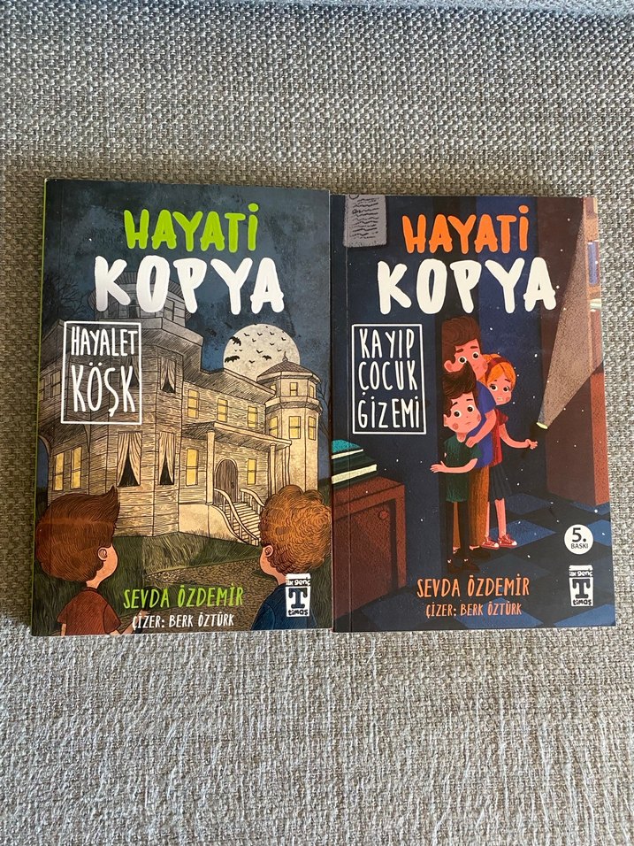 Sevda Özdemir'in yazdığı "Hayati Kopya" serisinden iki çocuk kitabı: "Hayalet Köşk" ve "Kayıp Çocuk Gizemi."