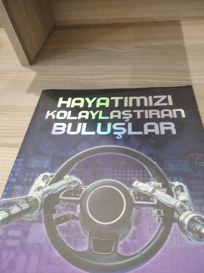 "Hayatımızı Kolaylaştıran Buluşlar" kitabı, hayatımızı kolaylaştıran buluşları anlatıyor. Kapakta robotik ellerle direksiyon resmi var.