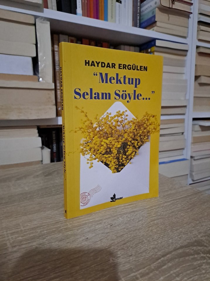 Haydar Ergülen'in 'Mektup Selam Söyle...' adlı romanı, sarı kapaklı ve zarf ile çiçek görseli içerir.