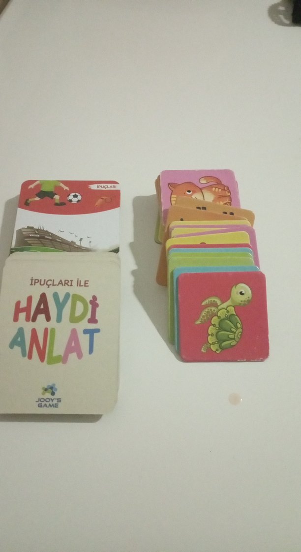 Renkli hayvan ve nesne kartları içeren, ipuçlarıyla hikaye anlatmayı teşvik eden çocuk puzzle oyunu. 57 adet haydi anlat kartı ve 48 adet eşleştirme kartları plastik kutu içerisinde gönderilecektir.