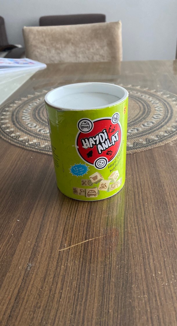Redka marka 5+ Renkli tasarıma sahip Haydi Anlat oyun kutusu, çok oyunculu oyunlar için kullanılır. Khaki renkli silindirik kutusu ve eğlenceli simgeleri bulunur. Bir tane küp eksiktir