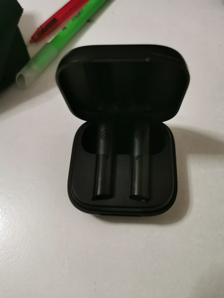 Kompakt şarj kutusuyla karanlık yeşil kablosuz kulaklık, kullanımı ve taşınması kolaydır. Batarya süresi ilk günkü gibi değil son fotoğrafta sağ tarafta bir çizik mevcut kutuda çizikler var harici hatasız
