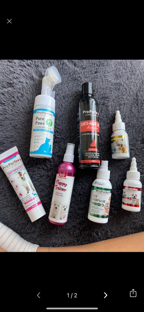 Tüy dökme önleyici şampuan, pati temizleme köpüğü, diş macunu, yavru köpek eğitici sprey ve parfüm içeren hayvan bakım seti.