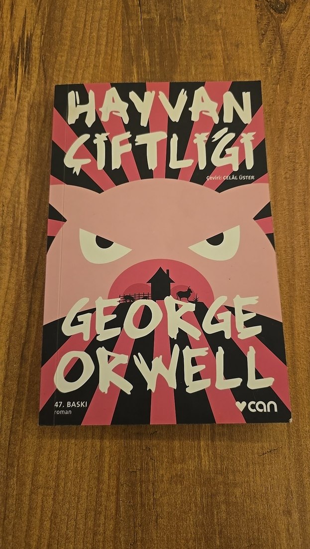 Can yayınlarından George Orwell'in 'Hayvan Çiftliği' romanının 47. baskısı. Kapakta belirgin bir domuz yüzü illüstrasyonu yer alıyor.
