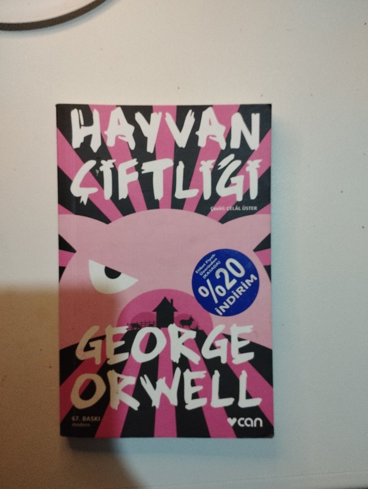 George Orwell'in Hayvan Çiftliği romanı, pembe bir domuz figürü ve %20 indirim etiketi ile dikkat çekiyor.