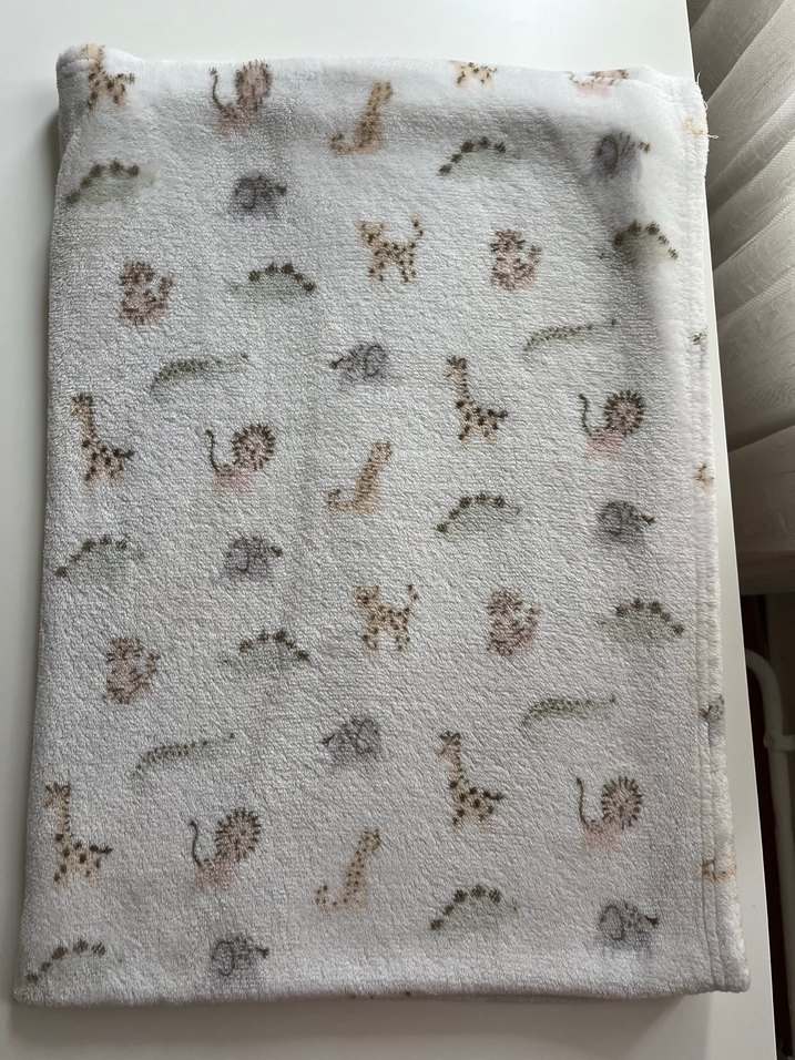 Açık gri zemin üzerine hayvan desenleriyle yumuşak ve sıcak çocuk battaniyesi. Rahat anlar için ideal. 71x98 cm