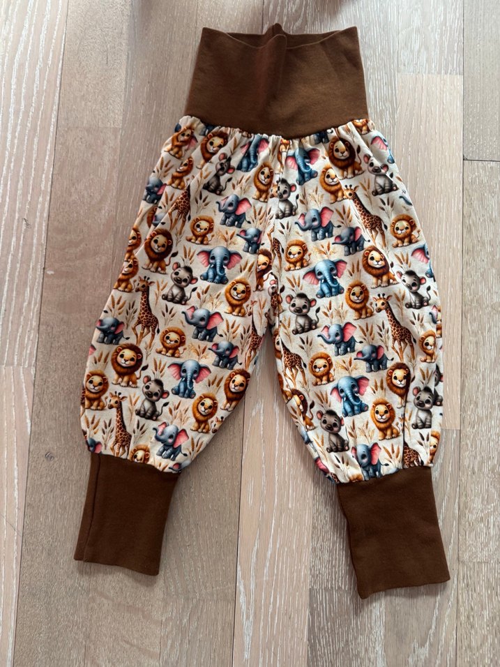Bohem tarzı, renkli hayvan desenli, gevşek kesim çocuk pantolonu, yumuşak kahverengi bel ve paçaları kıvrılarak daha küçük bedene uyup, çocuk uzadıkça açılarak kullanılabiliyor. Teyzemiz dikti markası yok. Hiç giyilmedi.
