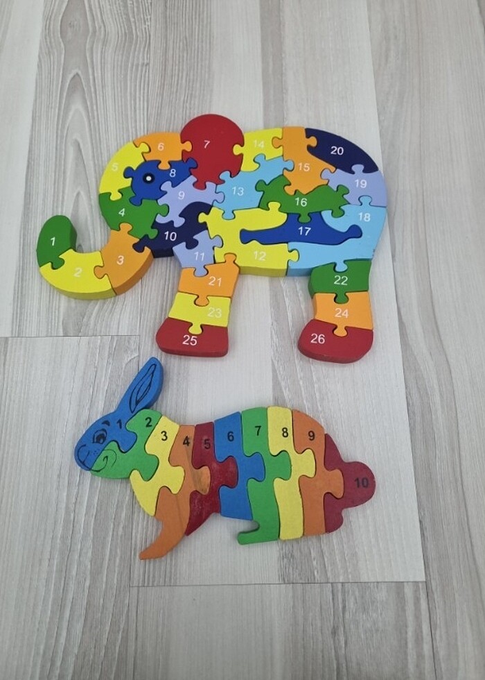 26 PARÇA FİL FİGÜRLÜ ÇİFT TARAFLI HARFLER VE RAKAMLAR OLAN VE 10 PARÇALI TAVŞAN FİGÜRLÜ AHŞAP PUZZLELAR.SAĞLAM VE KIRIK ÇATLAK YOK