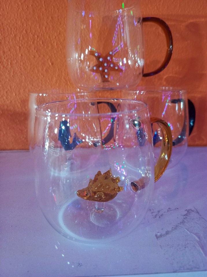 Her biri içinde deniz canlısı figürü olan, kahverengi saplı renkli cam kupalar seti,