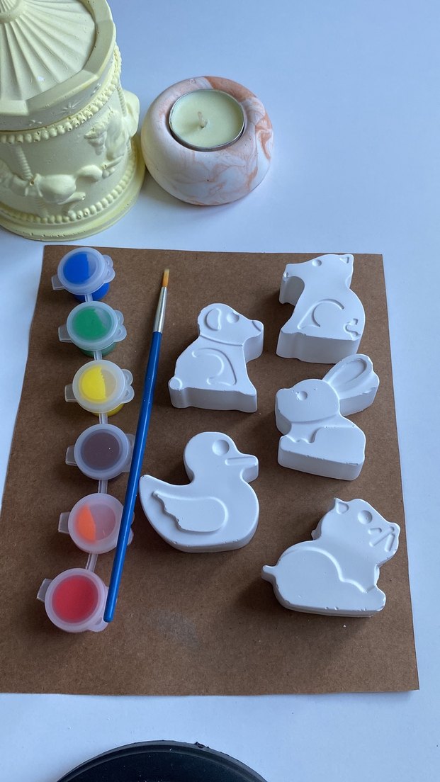 Altı beyaz hayvan figürü, altı canlı renkli boya ve bir fırça içeren boyama seti.