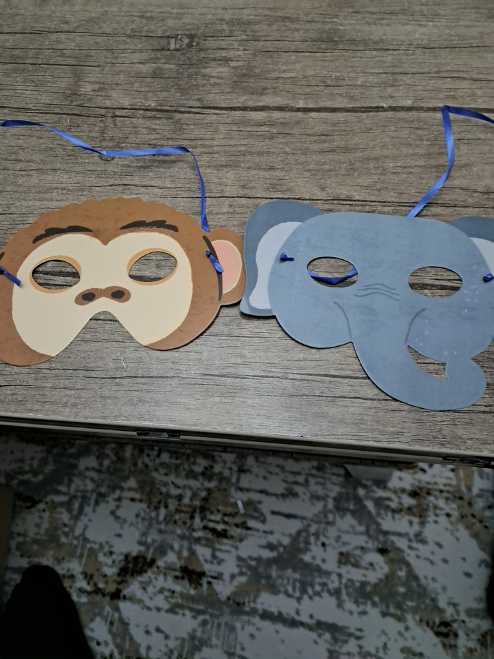 Mavi kurdeleli, maymun ve fil figürlü kağıt maskeler, göz delikleri bulunan çocuk maskeleri.