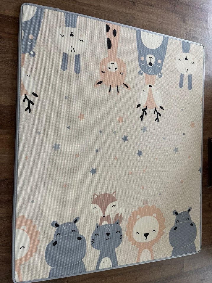 180x150 cm büyük boy, çift taraflı, hayvan, çiçek desenli bebek oyun matı. 2 cm kalınlıkta olup bebeğin düşüşlerinde maksimum koruma sağlıyor.