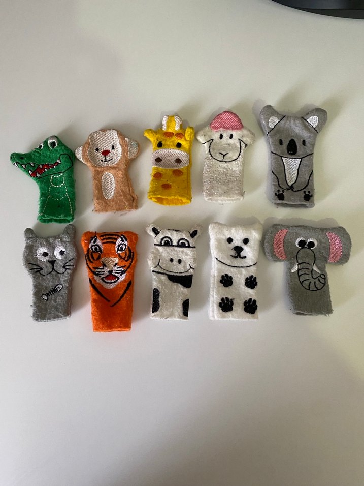 Timsah, aslan, zürafa ve fil gibi çeşitli hayvan figürlerinden oluşan renkli parmak kuklaları seti. Yumuşak dokulu ve detaylı tasarımlı.