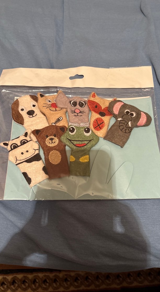 Köpek, kedi, fare, tilki, fil, inek, ayı ve kurbağa figürlü yumuşak kumaştan parmak kuklaları seti.