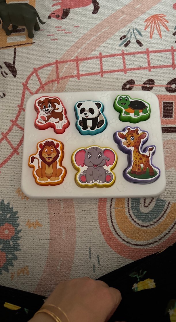 Renkli hayvan figürlü puzzle parçaları içeren eğitici oyuncak, çocukların öğrenme ve motor becerilerini geliştirir.