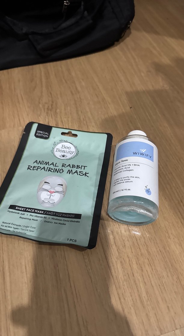 Hayvan temalı onarıcı yüz maskesi, doğal özler ve hyaluronik asit ile cildi nemlendirir ve onarır. Wiwiey tonik AHA, BHA ve kolajen içerir, cildi arındırır ve canlandırır.