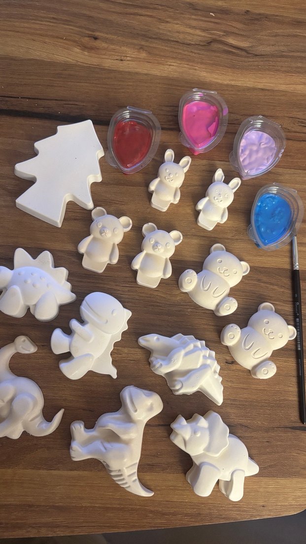 Beyaz hayvan ve ağaç figürleri, pürüzsüz malzemeden yapılmış, renkli boyalar ve fırça ile boyanmak üzere tasarlanmıştır. 13 figür ve 4 renk boya ve fırça