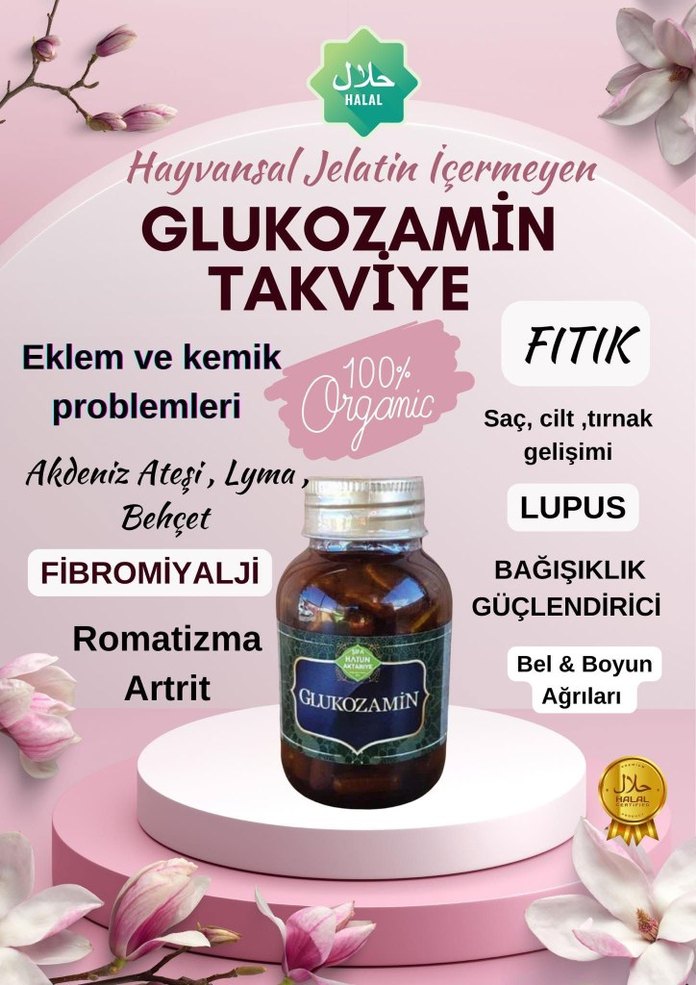 Hayvansal jelatin içermeyen glukozamin takviye, eklem ve kemik sağlığını destekler. Artrit, lupus, fibromiyalji gibi durumlara yardımcı olur, saç, cilt ve tırnak gelişimini destekler. Helal sertifikalı.
