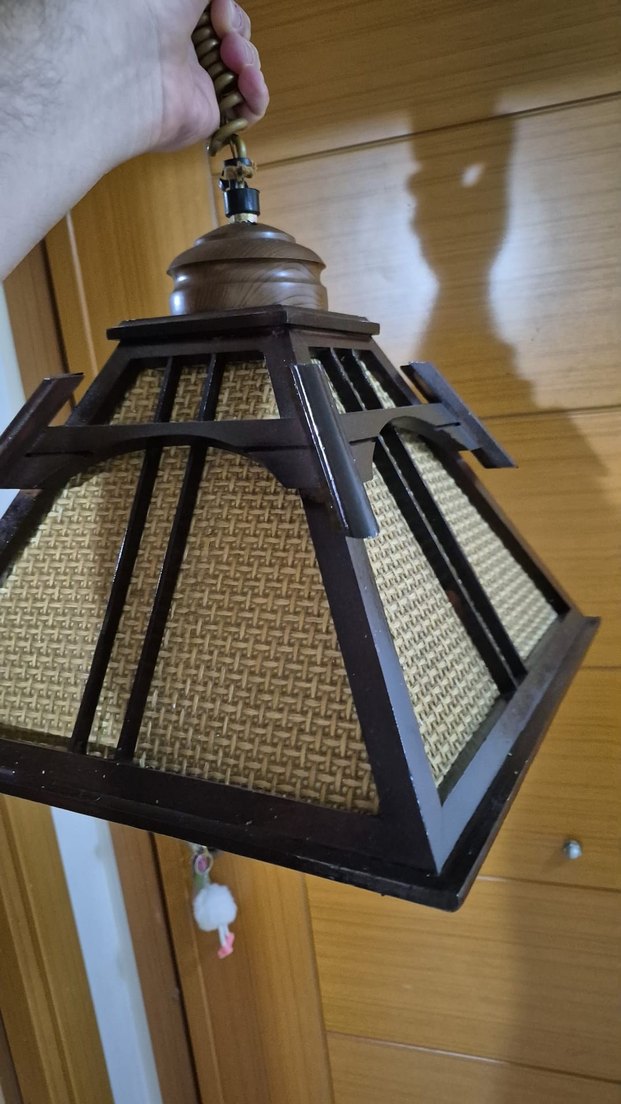 Ahşap üst kısmı ve koyu renk çerçevesiyle bej hasır desenli, rustik görünümlü avize. Mekanınıza doğal bir hava katar.