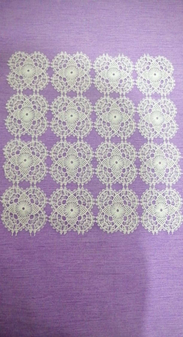 Mor zemin üzerine ince işlenmiş çiçek desenli el yapımı dantel masa örtüsü. Geleneksel tarzda zarif işçilik içerir.