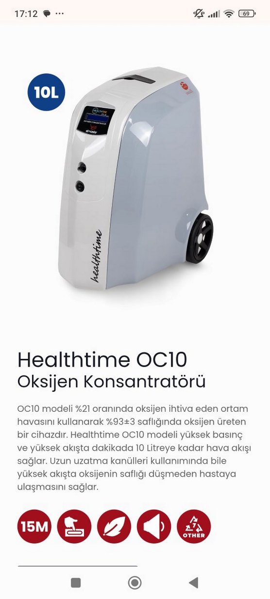 Healthtime OC10, %21 oksijen içeren havayı kullanarak %93 saflıkta oksijen üretir. Dakikada 10 litreye kadar yüksek akış sağlar, uzun kanüllerde bile oksijen saflığını korur. Gri renkte, tekerlekli taşınabilir cihazdır.28.07.2025 tarihinde alındı.27.10.2025 tarihine kadar kullanıldı.Yedek cihaz ile birlikte kullanıldı.Kullanim saati 710 garantisi devam ediyor.