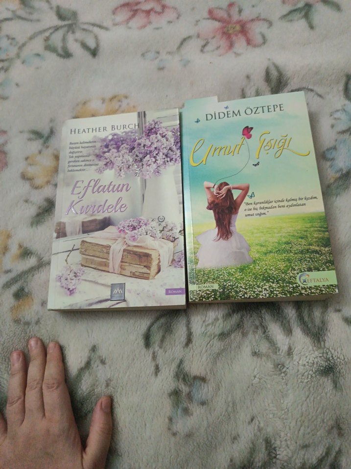 Heather Burch ve Didem Öztepe'nin çiçek ve doğa temalı kapaklı iki romanı. Biri menekşe çiçekleriyle mektuplar, diğeri çiçek tarlasında bir kadını gösteriyor. iki kitap bir arada